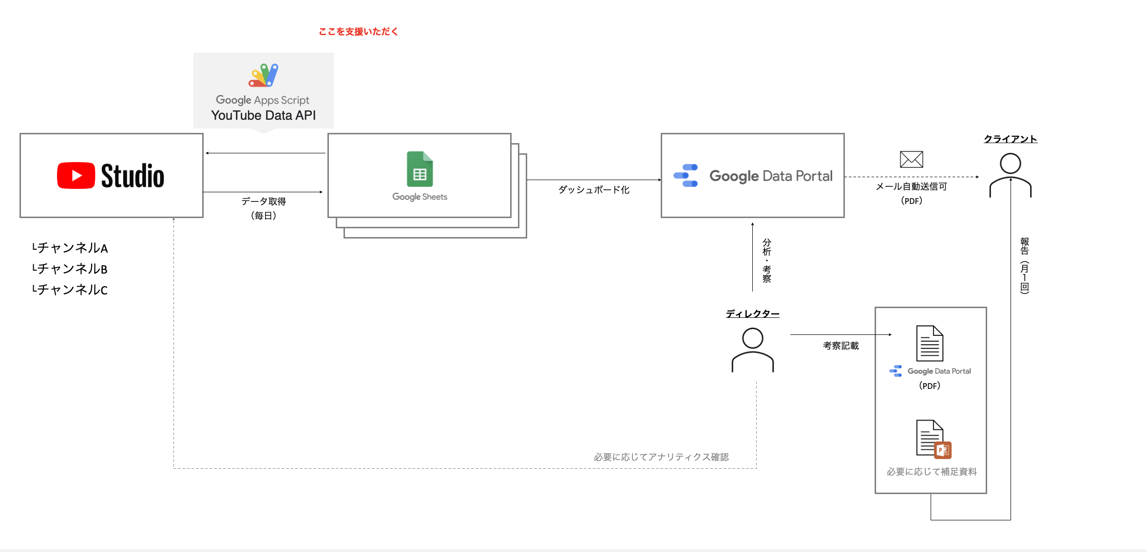 - Google Data Portalを使用して、グラフ化をしてクライアントへのレポーティングの簡易化を行います。